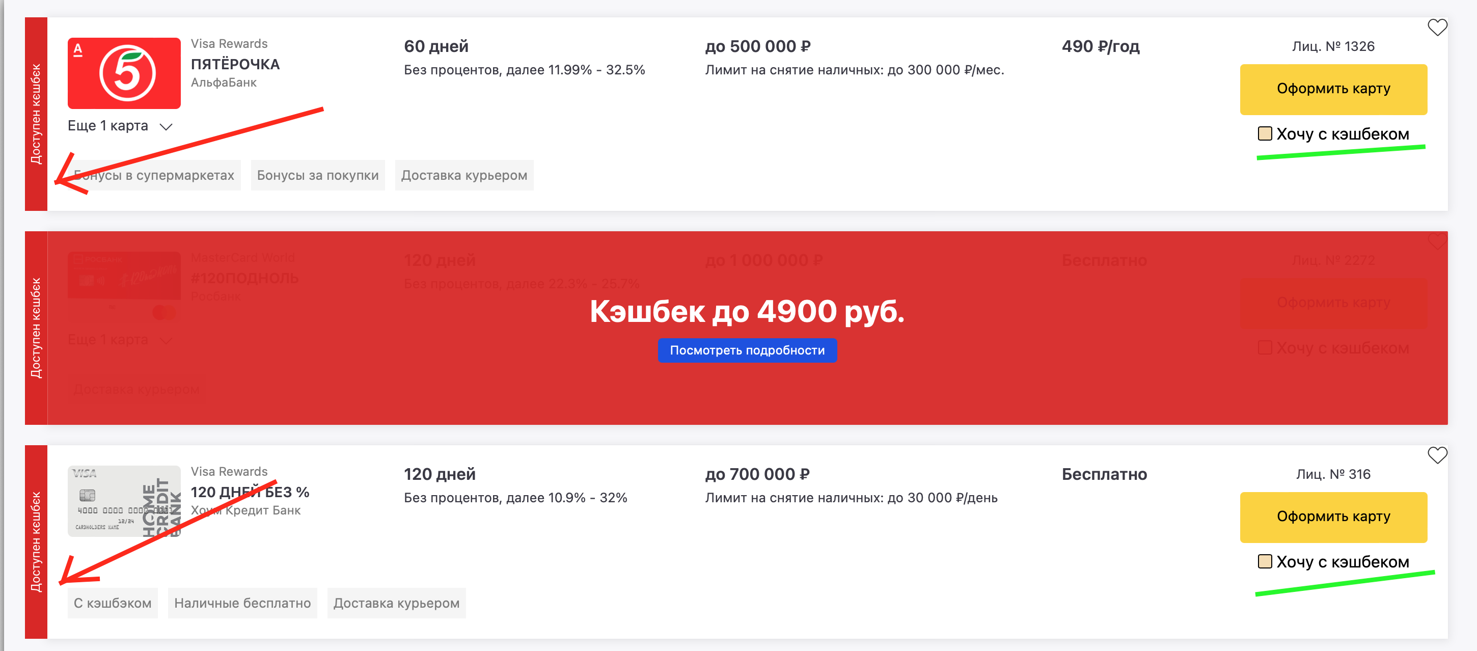 Большенство карт имеют кэшбэк, но стоит различать карту с кэшбэком и кэшбэк-сервис который возвращает деньги за оформления карты. Фильтр обведенный зеленым «Толко с кэшбэком» отображает все карты за которые вы гарантированно получите кэшбэк от нас.