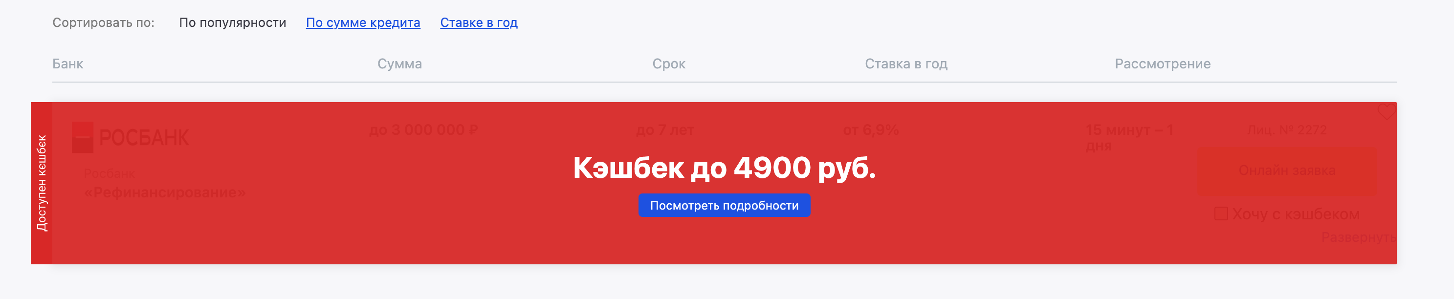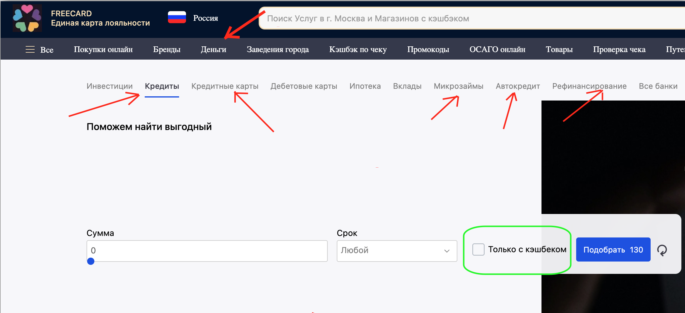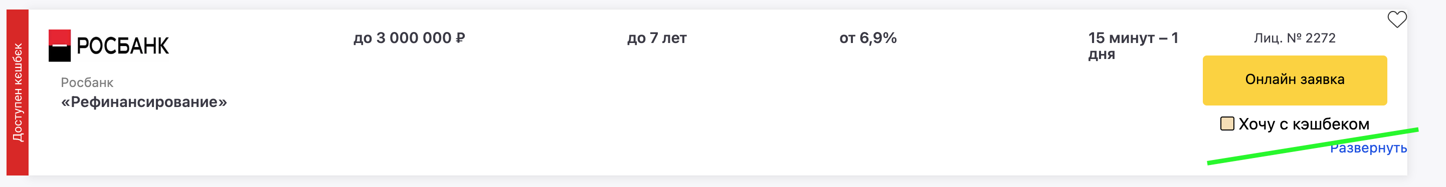 Фильтр обведенный зеленым «Толко с кэшбэком» отображает все кредитные предложения  за которые вы гарантированно получите кэшбэк от нас.